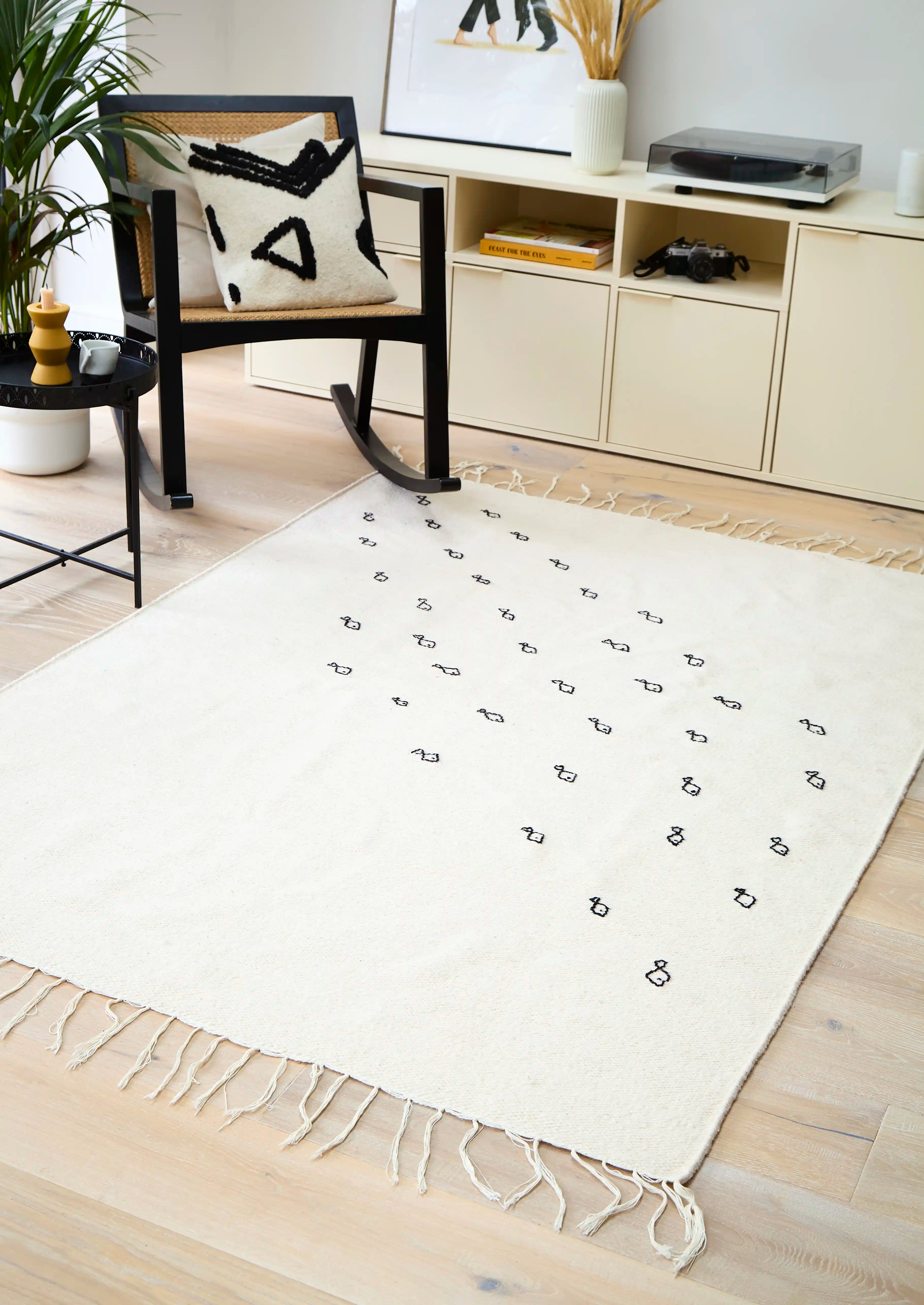 A cream wool berber rug with a black diamond pattern and plaited tassels folded over.